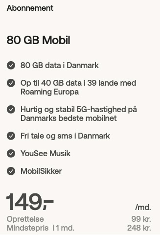 Du kommer på TDC NETs mobilnet, som er målt som Danmarks bedste af Teknologisk Institut for 8. år i træk. Så kan du ringe, sende beskeder, streame film og musik og surfe online på en lynhurtig og stabil forbindelse med markedets bedste dækning. Med YouSee Musik får du adgang til over 100 millioner musiknumre, som du kan lytte til på din mobil, tablet og pc - når og hvor du vil. YouSee Musik er inkluderet i Mobil 35 GB og Mobil 80 GB abonnementet. I alle abonnementer får du Roaming Europa, så du kan tage din mobil med på rejser til 36 lande i Europa uden at bekymre dig om regningen.